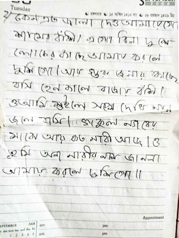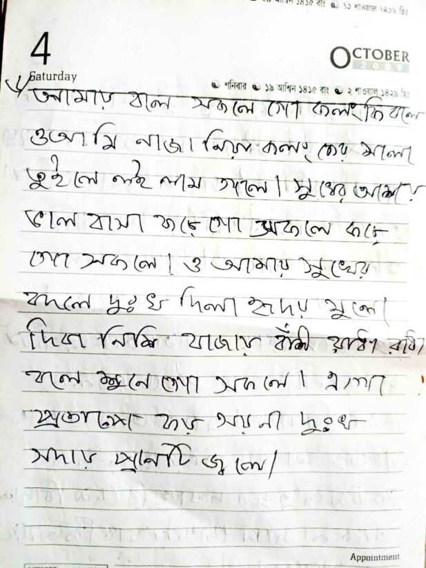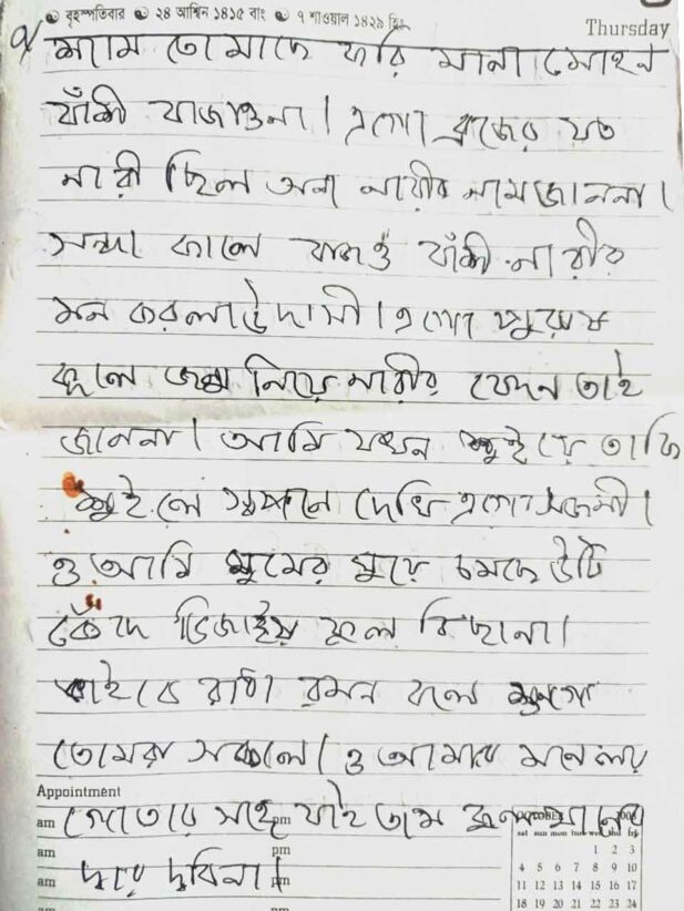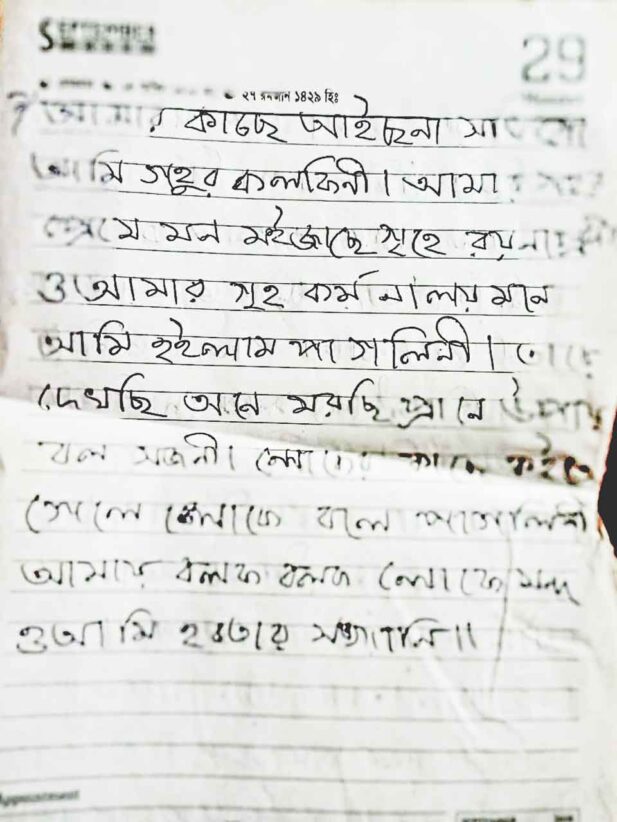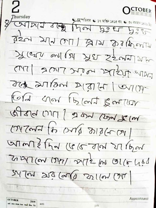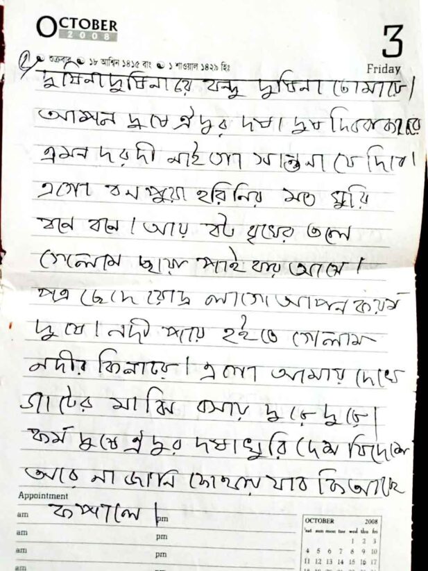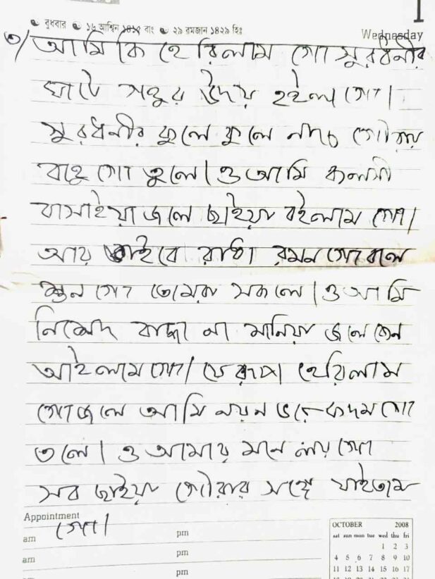 This handwritten notebook preserves Sylheti Dhamail songs, carefully penned. It documents lyrics, local expressions, and traditional tunes, capturing folk culture, women’s rituals, weddings, and everyday life in Sylhet through simple, authentic, and methodical recording.